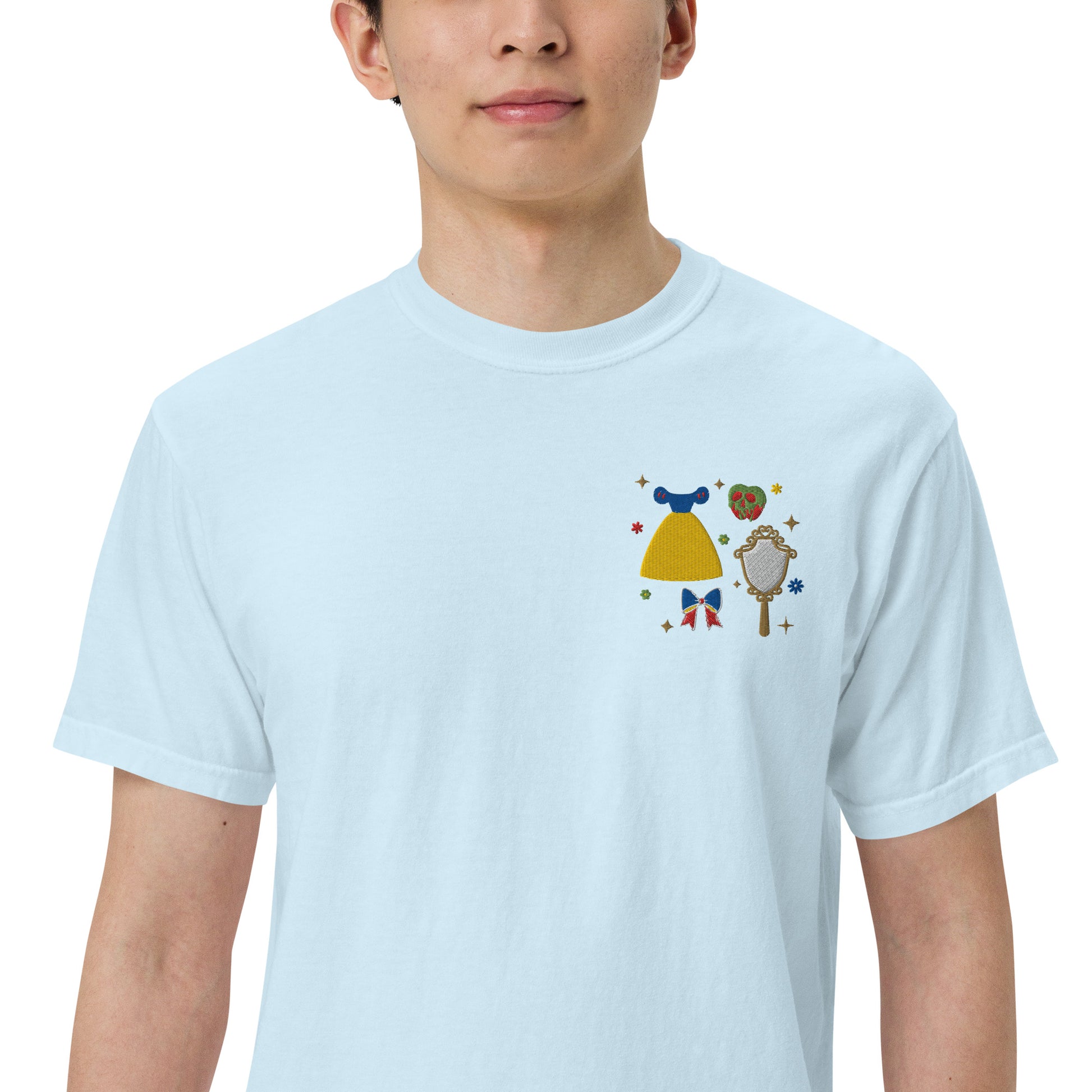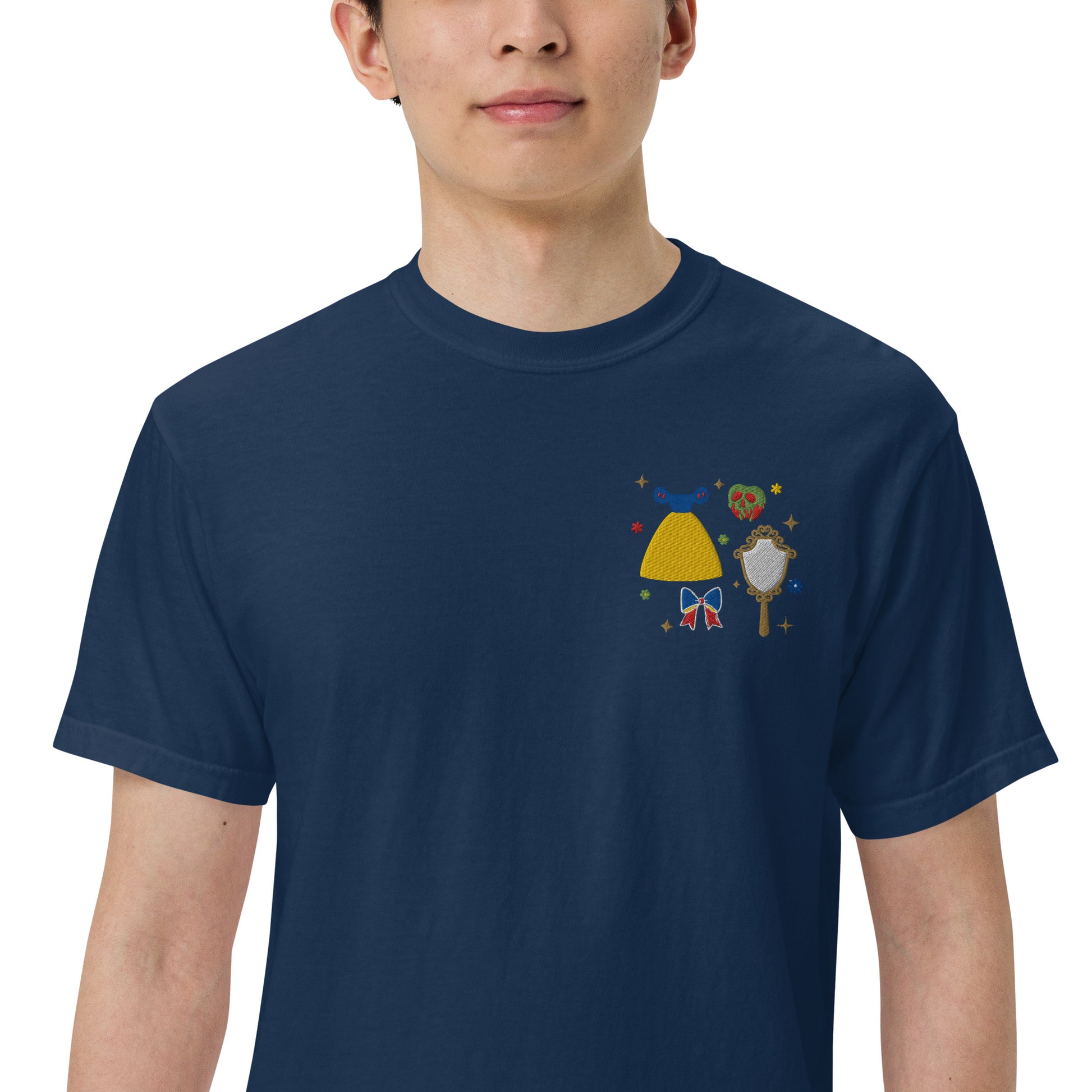 Bring a little storybook magic into your wardrobe with this beautifully detailed embroidered fairytale t-shirt, featuring symbolic elements like a classic royal dress, enchanted mirror, bow, and a tempting poison red apple. Thoughtfully stitched in vibrant thread, each symbol tells a tale of courage, beauty, and timeless charmβwithout saying a word.